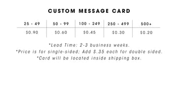 Minimum Order Spend for any customization is $250. Provide us your Brand Guidelines, inspiration, and vision for the project and we’ll create two options for your review, up to three revisions. $75 one-time design fee.
