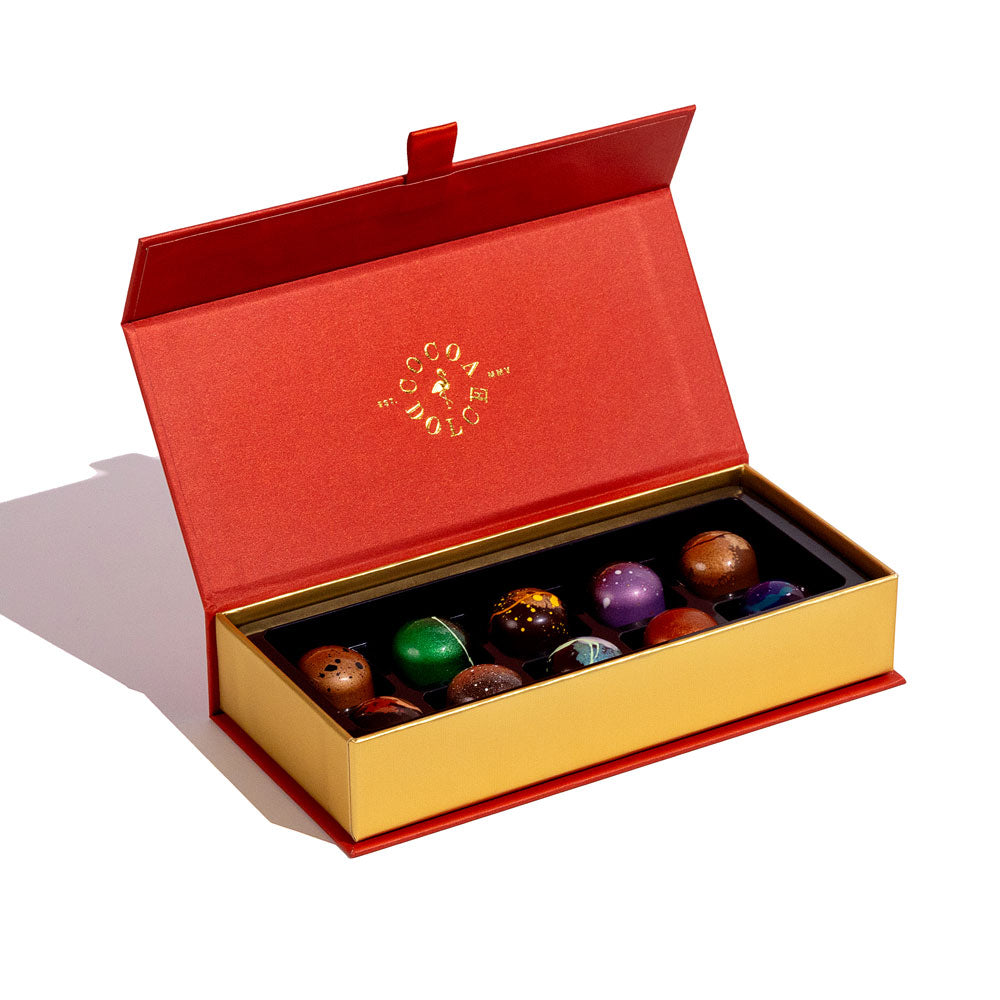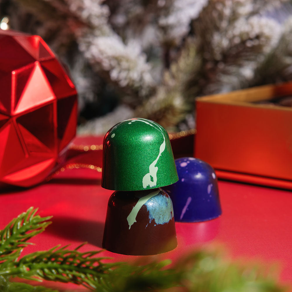 Apple Cider (organic apples), Chocolate (cocoa beans, cane sugar, cocoa butter, sunflower lecithin, vanilla beans, full cream milk, lactose, cocoa mass, soy lecithin, natural vanilla flavoring), Brown Sugar (cane sugar, molasses), Cream, Glucose (glucose syrup, sodium bisulfate, sulfites), Salted Caramel (sugar, cream, vanilla bean paste [sugar, water, vanilla extract, gum tragacanth], butter [pasteurized cream], coarse salt [salt, yellow prussiate of soda], glucose syrup), Pistachio Crumb (white chocolate, pistachio compound [glucose syrup, invert sugar syrup, almond pulp, pistachio pulp, hazelnut pulp, concentrates [carrot, spirulina], natural flavoring], coarse salt, cocoa butter, sugar, brown sugar, cake flour [enriched flour bleached [wheat flour, niacin, iron, thiamin mononitrate, riboflavin, folic acid], baking powder [sodium bicarbonate, cornstarch, sodium aluminum sulfate, calcium sulfate, monocalcium phosphate], Pistachios, canola oil, Madagascar Vanilla Extract [water, alcohol, sugar, vanilla bean extractives]), Cocoa Butter (cocoa butter and FD&C and Lake Colors: blue 1, blue 2, red 40, yellow 5, yellow 6, natural colors, TiO2), Pate de Fruit (water, sugar, black cherry puree, pectin, tartaric acid), Inverted Sugar Syrup, Madagascar Vanilla Extract, Pecans, Pumpkin, Irish Whiskey (rye), Baking Soda (sodium bicarbonate), Pistachio Compound, Vanilla Bean Paste, Raw Sugar, Maple Syrup, Sour Cream (cultured cream, grade A whey, modified food starch, sodium phosphate, sodium citrate, guar gum, carrageenan, calcium, sulfate, potassium sorbate, locust bean gum), Cocoa Powder (alkalized cocoa), Crème Brulee Sauce (milk, cane sugar, egg yolk, natural flavors, sulfites, plant extractives), Cinnamon, Whiskey (rye), Ginger Tea Crystals (cane sugar, honey, ginger), Orange Compound (glucose syrup, invert sugar syrup, concentrated orange juice, citric acid, ethyl alcohol, natural flavoring, color [carotene], modified starch), Espresso Powder, Nutmeg, Allspice, Peppermint Oil