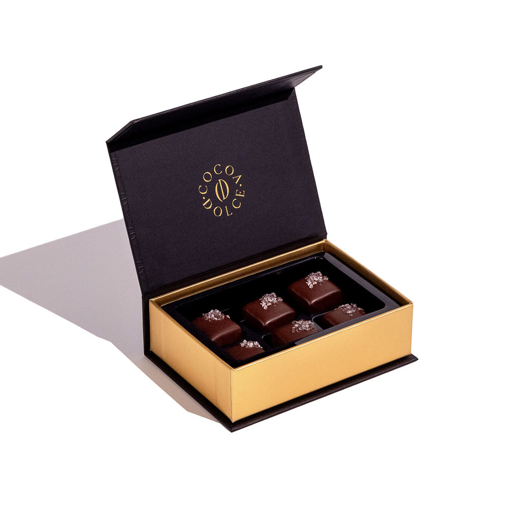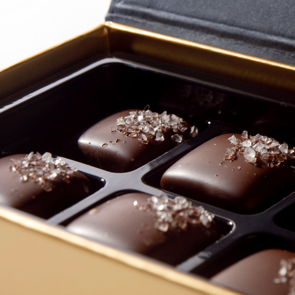 This box features one of our most popular flavors, Grey Salt Caramel. So popular, it deserves it's own box! Buttery brown sugar and vanilla bean caramel en-robed in bittersweet chocolate with a dusting of French grey sea salt. Is your mouth watering yet?!?