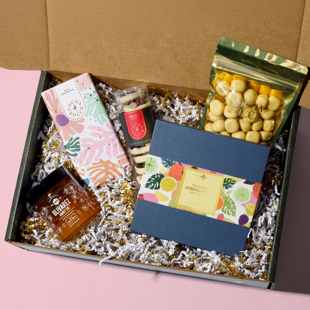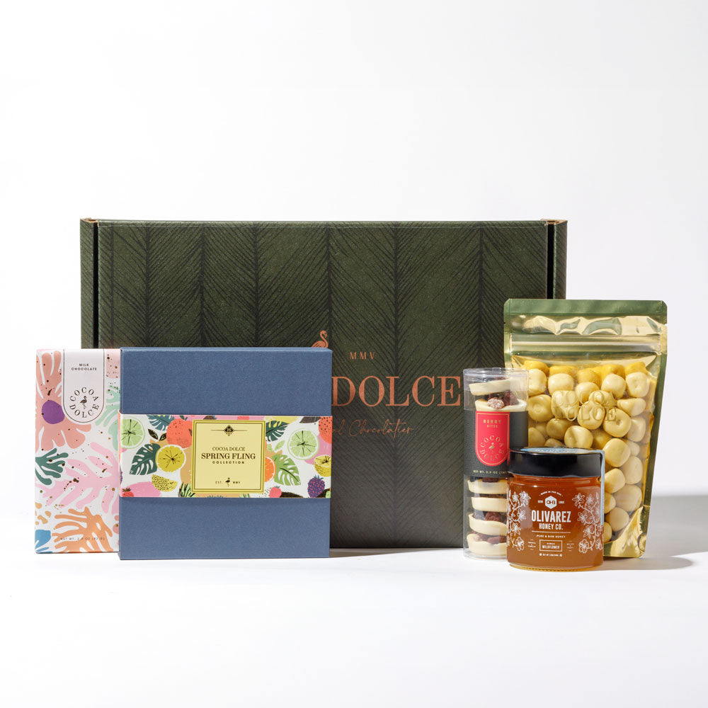 Gift Set Includes 16-Piece Spring Fling Collection, Full Milk Chocolate Bar, Berry Bites, Lemon Shortbread, and Olivarez Honey