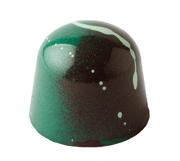 White chocolate ganache with pistachio crumb and a creamy pistachio center in a dark chocolate shell.