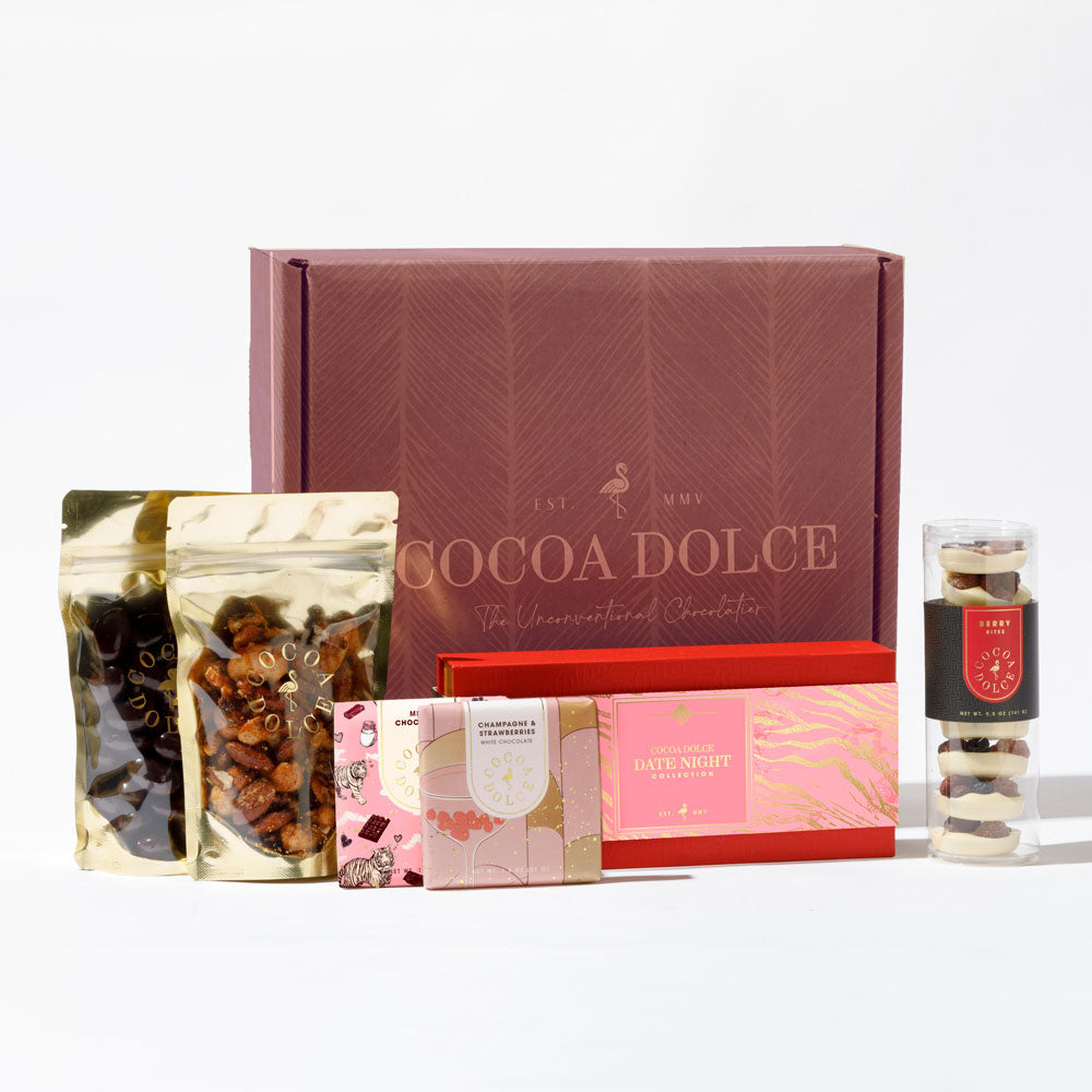 An indulgent gift set including our 10-Piece Date Night Collection, Mini Milk Chocolate Bar, Mini Champagne & Strawberries Bar, Mini Dark Chocolate Covered Almonds, Mini Spicy Nut Mix, and crunchy Berry Bites—crafted to satisfy every craving.